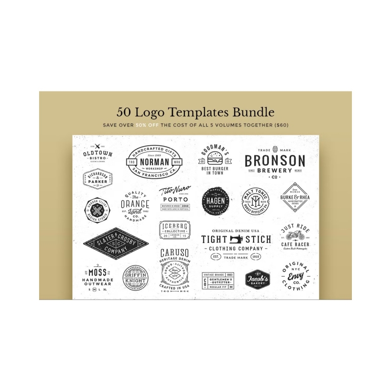 مع هذه الحزمة ، لديك فرصة للحصول على جميع حزم قوالب الشعارات ال 5 وتوفير أكثر من 50٪ من سعرها العادي (60 دولارا). هذا هو 50 قالب شعار متجه يمكنك استخدامه لمشاريع العلامات التجارية والملصقات وتصميم الملابس وقطع الطباعة والمزيد. كلها قابلة للتحرير بالكامل مع تضمين الخطوط المجانية فقط!