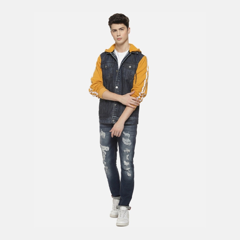 Men Charcoal Mustard Washed Colourblocked Windcheater Denim Jacket