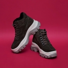 • A pair of Black heeled boots has regular ankle and lace-ups