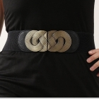 This stretchy belt is made up of 70% Polyester, 25% Elastane, 5% PU Leather and metal fastening buckle, easy and convenient to wear and take Off.